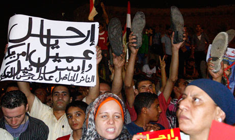 Wütende Demonstranten sangen anti-Morsi-Lieder und gegen die Moslembruderschaft. Andere hielten Schuhe in die Höhe und rote Karten als Zeichen ihrer Verachtung.